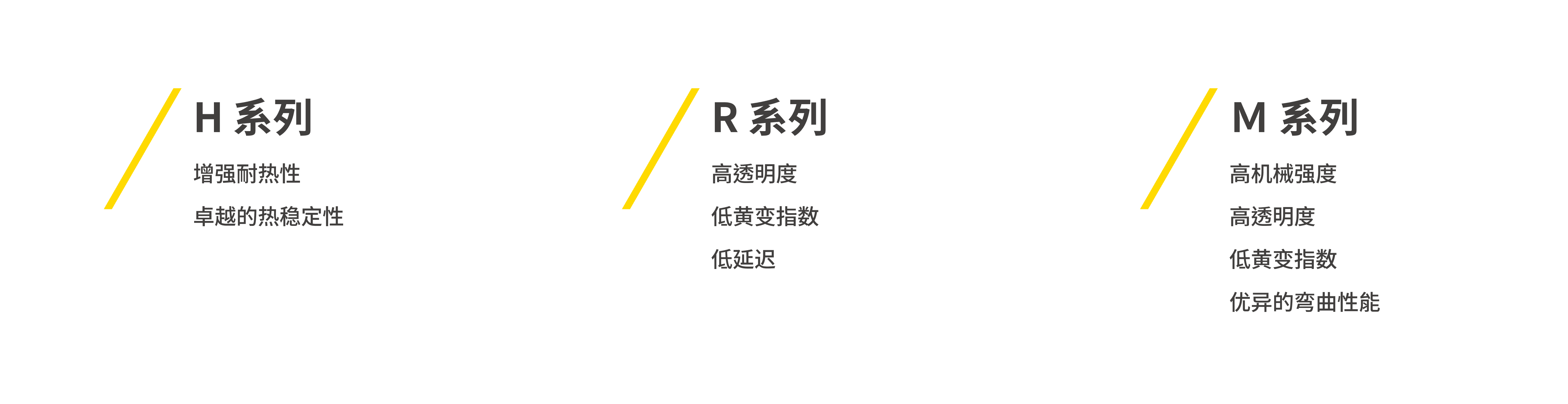 为满足不同终端应用需求,LCY 提供 H、R、M 三大 CPI 系列,分别针对耐热性能、光学稳定性与机械弯折能力进行强化,使客户能够精准选型:H 系列侧重高耐热性与长期稳定性,适用于高温或严苛环境;R 系列具备低黄变与低延迟优势,适合高端光学与显示应用;M 系列则在透明度、机械强度与柔性之间取得最佳平衡。